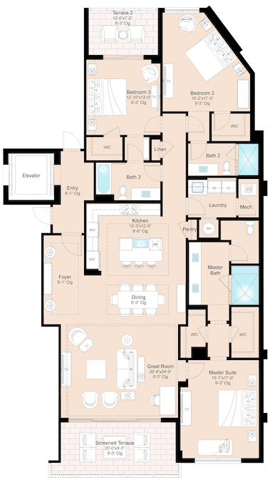 • Private, spacious screened sunrise terrace and open-air sunset terrace